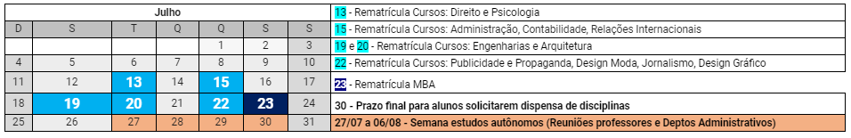 | 13/07 | Rematrícula Cursos: Direito e Psicologia |